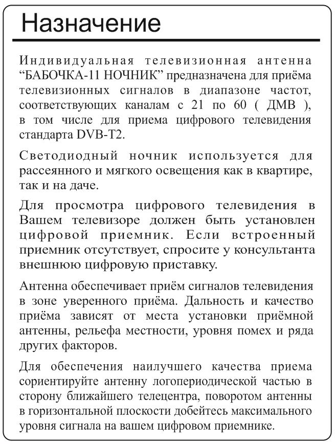 - "БАБОЧКА-11 НОЧНИК" С ПОДСВЕТКОЙ комнатная телевизионная антенна предназначена для приема цифрового DVB-T2 и аналогового телевизионного сигнала ДМВ диапазона