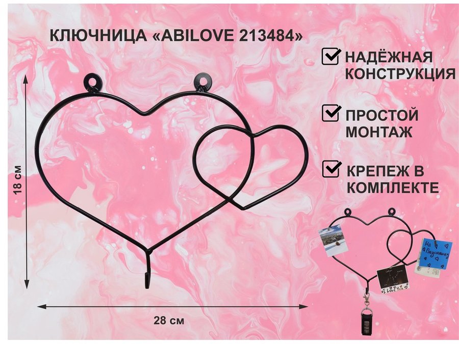 Ключница с крючком и 3 магнитами для записок и фотографий, 3 сердца,вешалка, чёрный "ABILOVE 213495"