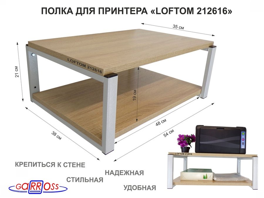 Полка для принтера, подставка для МФУ, 21см серый "LOFTOM 212615" две полки 35х54см,сосна выбеленная