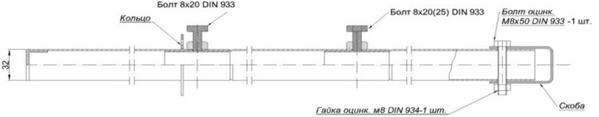 Для наращивания прямых участков применяется элемент "ХОМУТТО-32B", с одной стороны он обжат, а с друхой имеет вваренную гайку и болт М8х30 для соединения деталей.