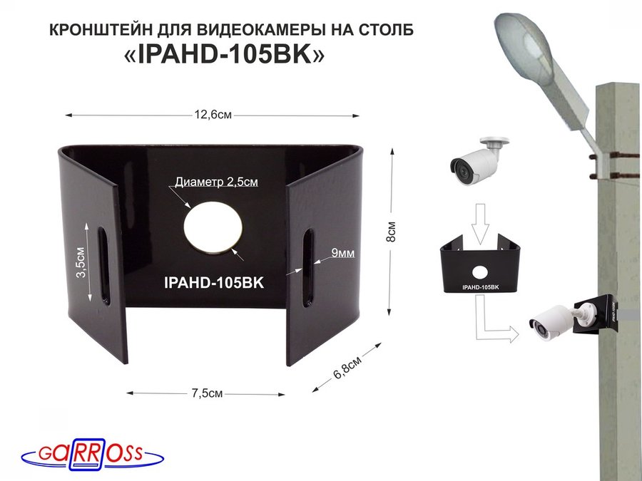 В корзину Купить в 1 клик Кронштейн мини для одной камеры на столб "IPAHD-105BK-89852" черный под СИП-ленту, вылет 8см