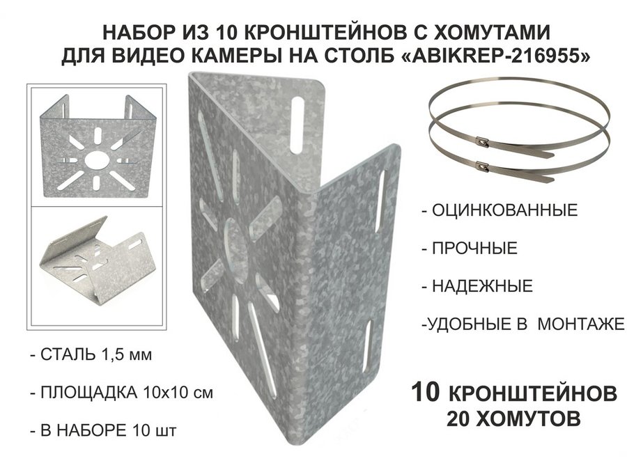 В корзину Купить в 1 клик Набор 10шт. Кронштейн оцинкованный для камеры наблюдения с хомутами на столб "ABIKREP-216955"