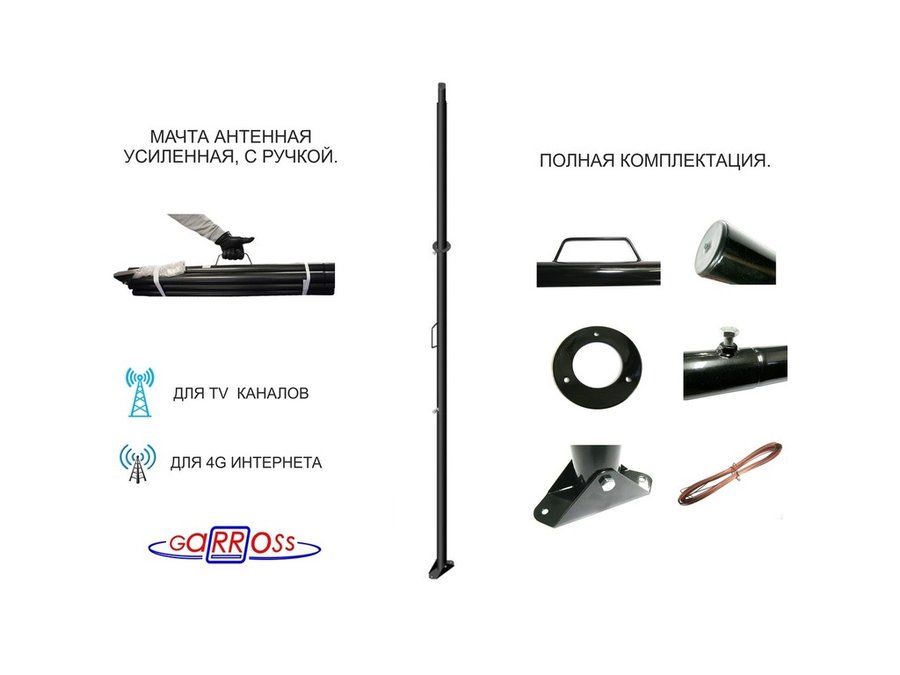 - Мачта усиленная в комплекте с растяжкам и подпятником предназначена для крепления одной или нескольких антенн мобильного интернета или телевизионного приема на наклонной и плоской крыше