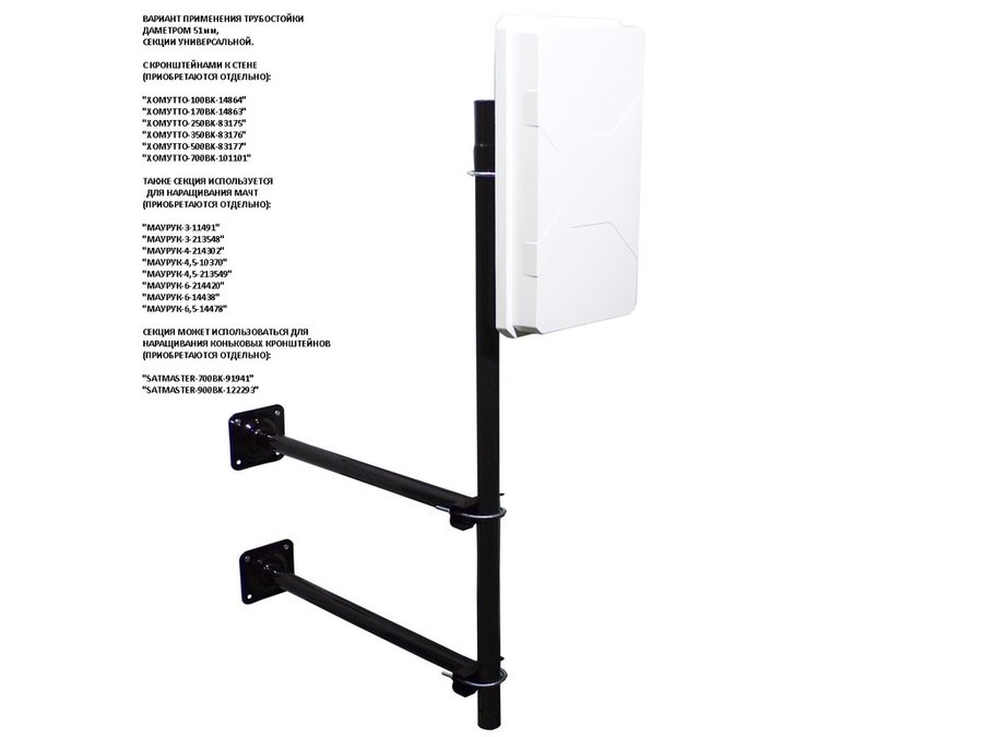 - Данную секцию можно использовать в качестве как нижнего звена мачты , т.к. в нижней части секции есть отвестия для установки подпятника, так и в качестве среднего или верхнего звена за счёт наличия болта для фиксации звена к звену на одном конце секции и обжатия трубы на другом конце. Также применяется с кронштейнами "ХОМУТТО" для крепления к стене и на торец крыши анттенн, также подходит для коньковых кронштейнов серии "SATMASTER-700", "SATMASTER-900".