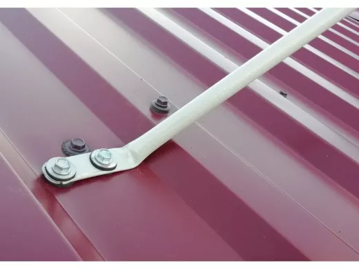 - Для крепления используются два отверстия в подпятнике и по одному отверстию в каждой растяжке. Удобно использовать кровельные саморезы максимального диаметра и длины, чтобы обеспечить надёжность фиксации.