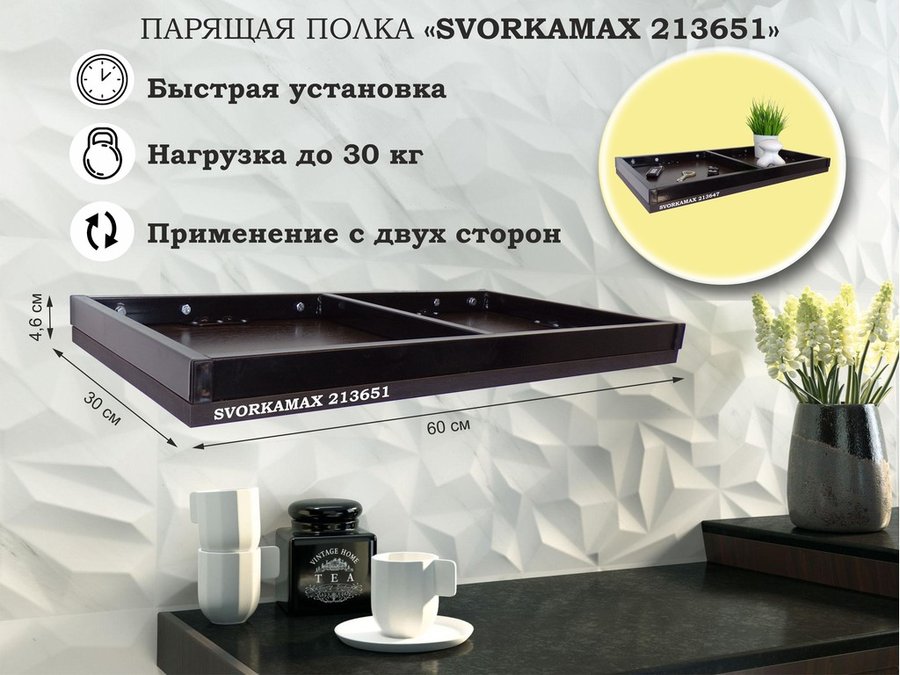 В корзину Купить в 1 клик Парящая полка скрытого крепления, бортики из металла , черный "SVORKAMAX 213651" 60х30 см, венге