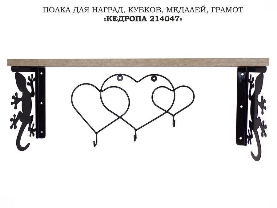 Полка для наград, кубков, медалей, грамот "КЕДРОПА-214047 гекон"размер 15х60х24 см, дуб с сердцами