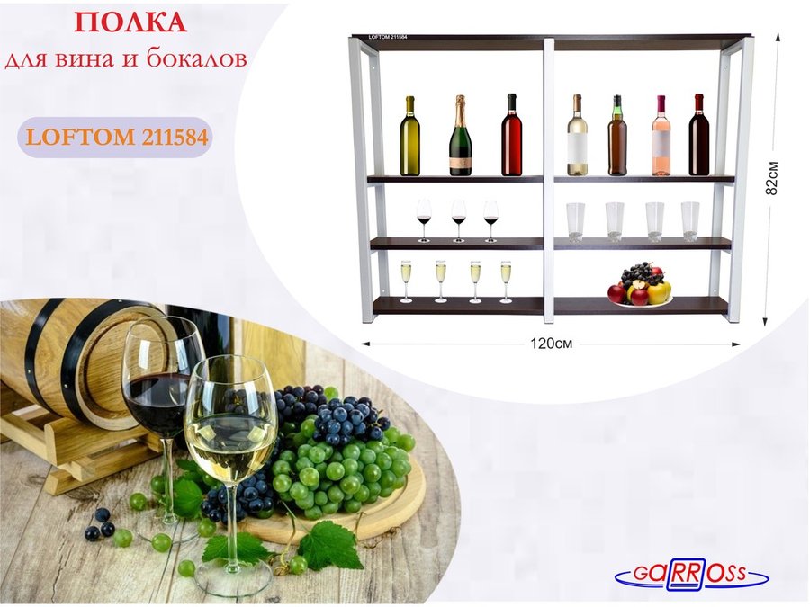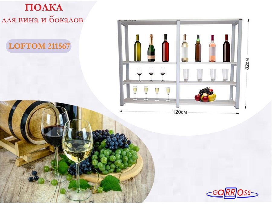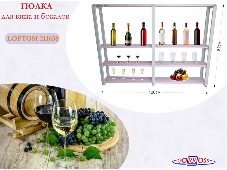 Полка для вина и бокалов, высота 82см, 4 уровня, размер полки 10х120см, серая "LOFTOM 211659"салатов
