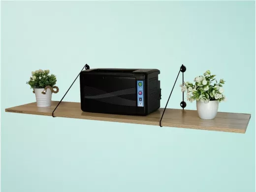 - Полка надежно крепится к стене при помощи анкеров или шурупов с дюбелями, на ней можно разместить принтер, бумагу