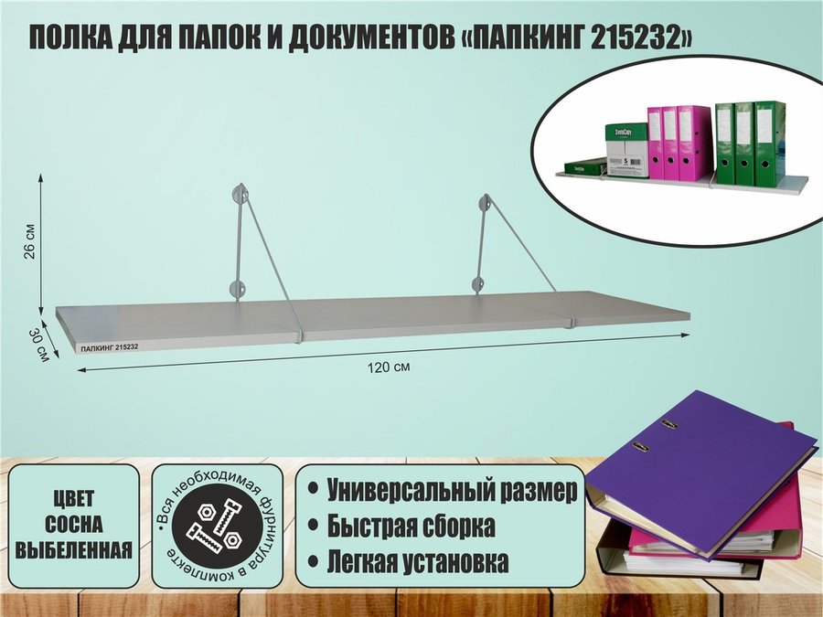 В корзину Купить в 1 клик Полка для папок и документов "ПАПКИНГ 215240" высота 26 см размер 120x30 белый и сосна выбеленная