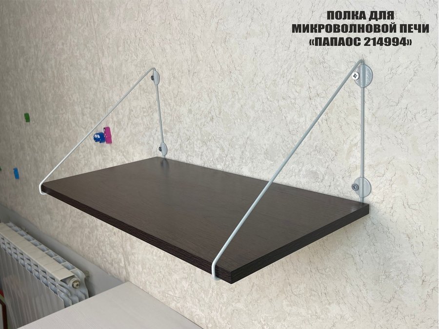 - Полка надежно крепится к стене при помощи анкеров или шурупов с дюбелями, на ней можно разместить микроволновую печь, кухонную технику, посуду, специи и многое другое