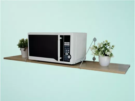 • Полка надежно крепится к стене при помощи анкеров или шурупов с дюбелями, на ней можно разместить микроволновую печь, кухонную технику, посуду, специи