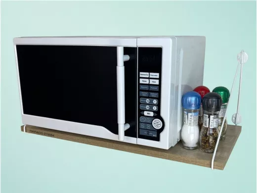 - Полка надежно крепится к стене при помощи анкеров или шурупов с дюбелями, на ней можно разместить микроволновую печь, кухонную технику, посуду, специи