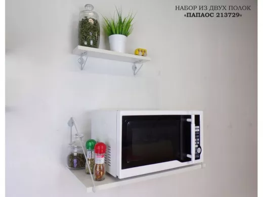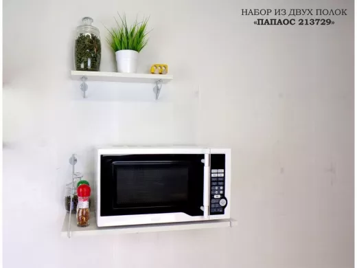 - Комплект из двух настенных полок имеет лаконичный и стильный дизайн, идеально подойдет для любого интерьера и существенно сэкономит место на кухне