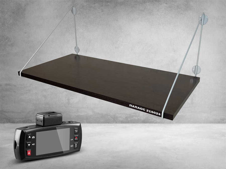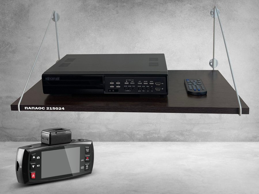 Полка надежно крепится к стене при помощи анкеров или шурупов с дюбелями, на ней можно разместить видеорегистратор, монитор и многое другое