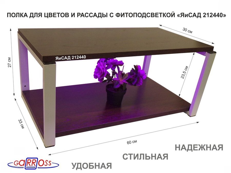 Полка для цветов и рассады с фитоподсветкой, высота 25см, серый "ЯиСАД 212440" 60х30, венге