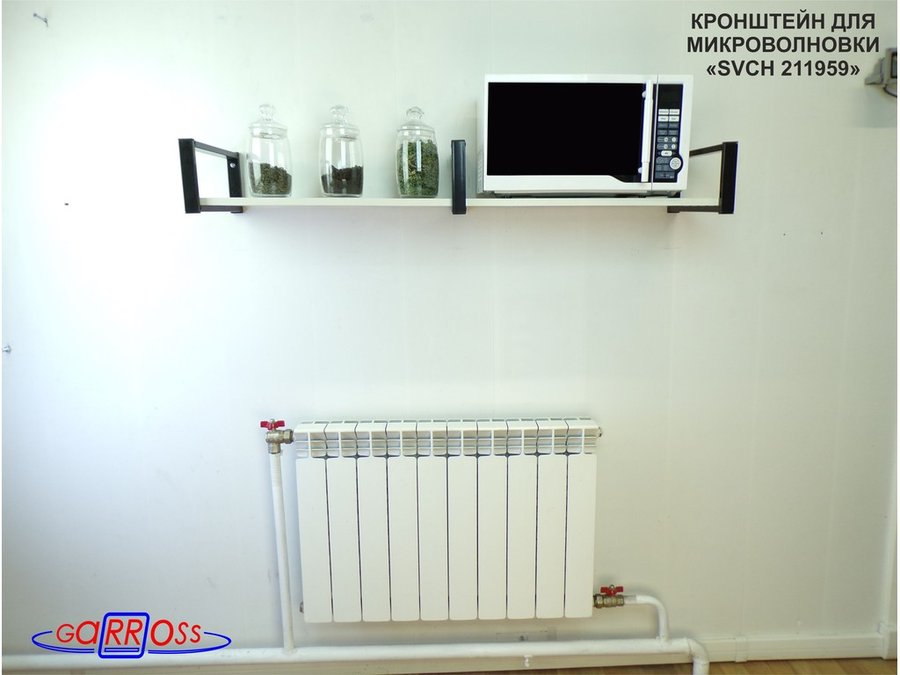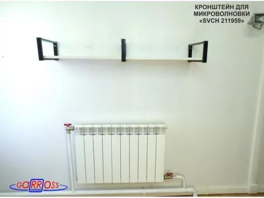 - Полка надежно крепится к стене при помощи анкеров или шурупов с дюбелями, на ней можно разместить микроволнрвую печь, кухонную технику, посуду, специи