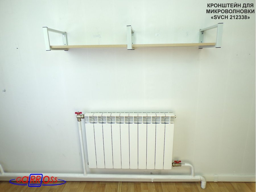 - Полка надежно крепится к стене при помощи анкеров или шурупов с дюбелями, на ней можно разместить микроволнрвую печь, кухонную технику, посуду, специи