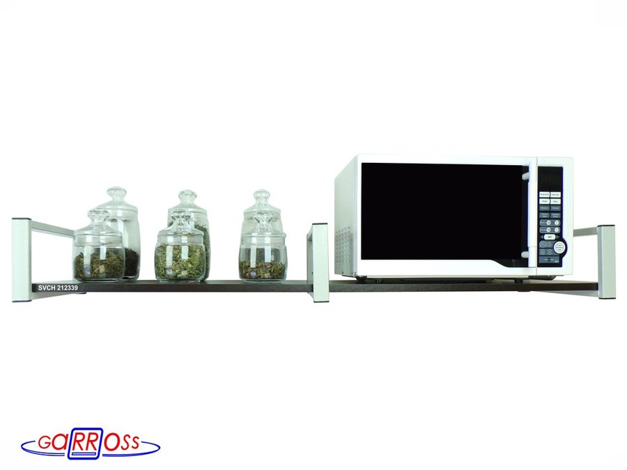 - Полка надежно крепится к стене при помощи анкеров или шурупов с дюбелями, на ней можно разместить микроволнрвую печь, кухонную технику, посуду, специи