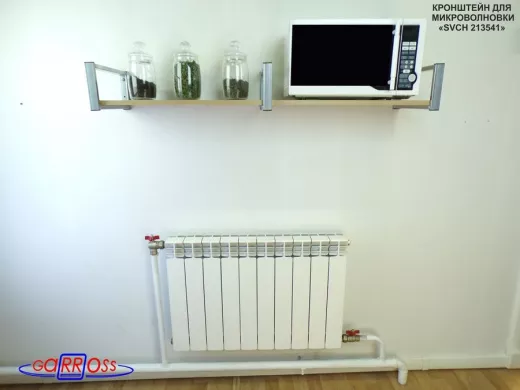 - Полка надежно крепится к стене при помощи анкеров или шурупов с дюбелями, на ней можно разместить микроволнрвую печь, кухонную технику, посуду, специи