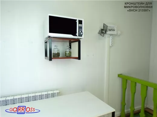 - Полка надежно крепится к стене при помощи шурупов с дюбелями, на ней можно разместить микроволновую печь, тостер, кофемашину, чайник, посуду, специи