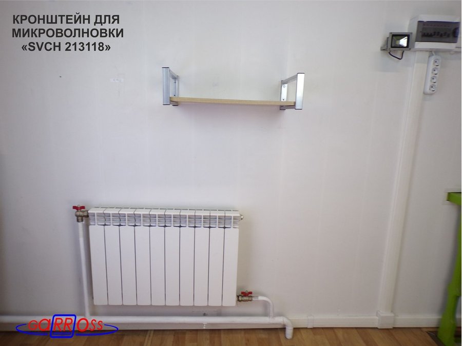 - Полка надежно крепится к стене при помощи анкеров или шурупов с дюбелями, на ней можно разместить микроволновую печь, кухонную технику, посуду, специи
