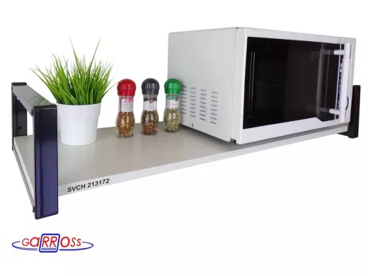 - Надежно крепится к стене при помощи шурупов с дюбелями, на ней можно разместить микроволновую печь, кофемашину, кухонную технику, посуду, специи