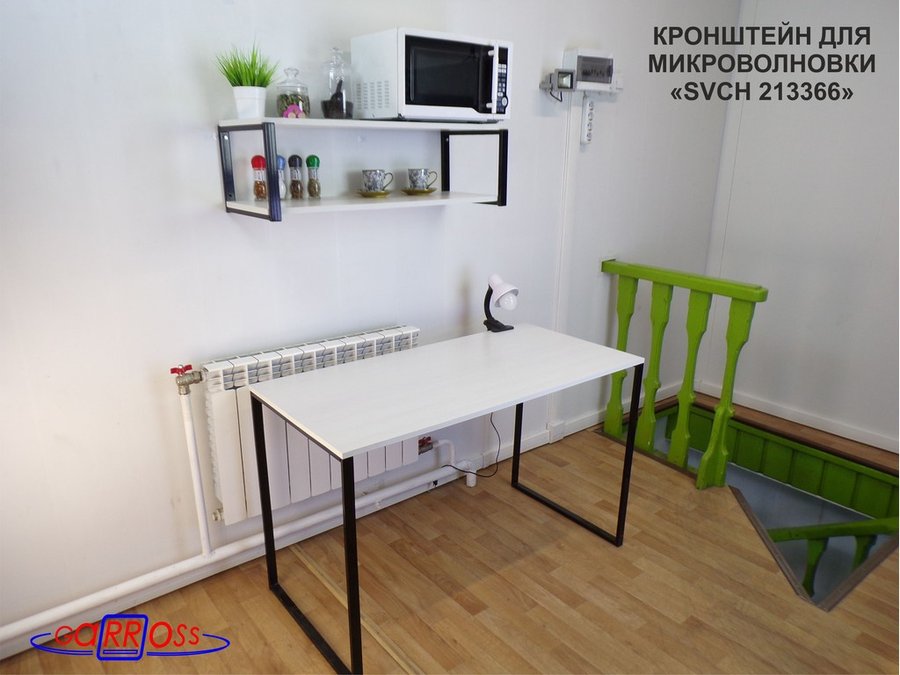 • Полка надежно крепится к стене при помощи анкеров или шурупов с дюбелями, на ней можно разместить микроволновую печь, кухонную технику, посуду, специи