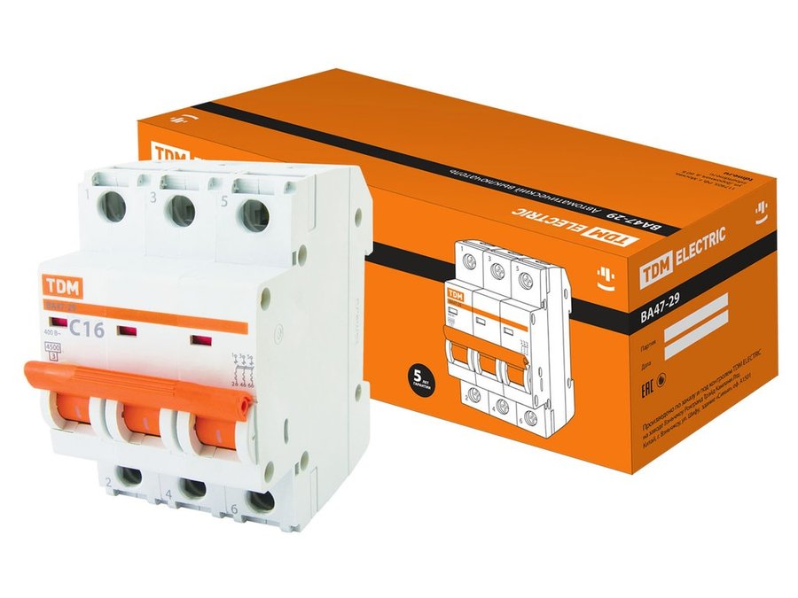 В корзину Купить в 1 клик Автоматический выключатель ВА47-29 3Р 16А 4,5кА х-ка С TDM SQ0206-0109