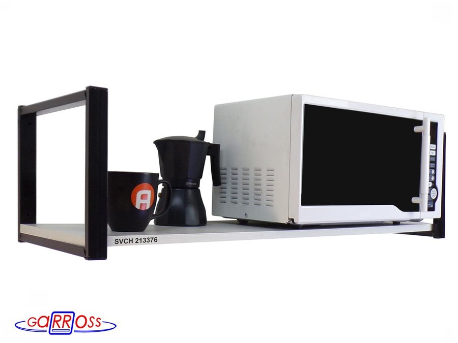 • Полка надежно крепится к стене при помощи анкеров или шурупов с дюбелями, на ней можно разместить микроволновую печь, кухонную технику, посуду, специи