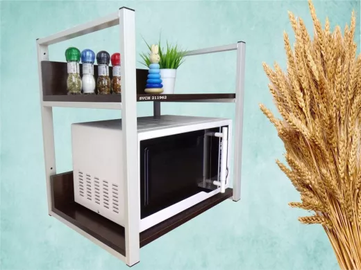 • Полка надежно крепится к стене при помощи анкеров или шурупов с дюбелями, на ней можно разместить микроволновую печь, тостер, кофемашину, чайник, посуду, специи