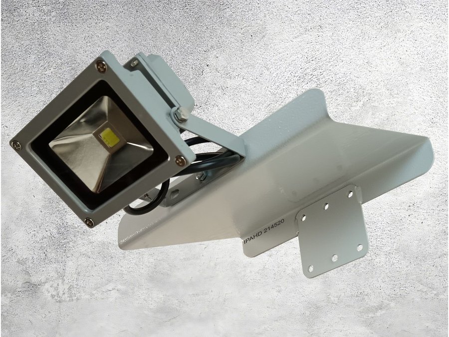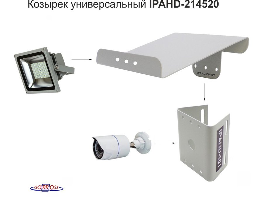 Кронштейн-козырек крепится на стену и кронштейны на столб серии IPAHD для видеокамер, оснащенные тремя отверстиями для креления опций. На козырьке спереди есть три отверстия для крепления прожектора
