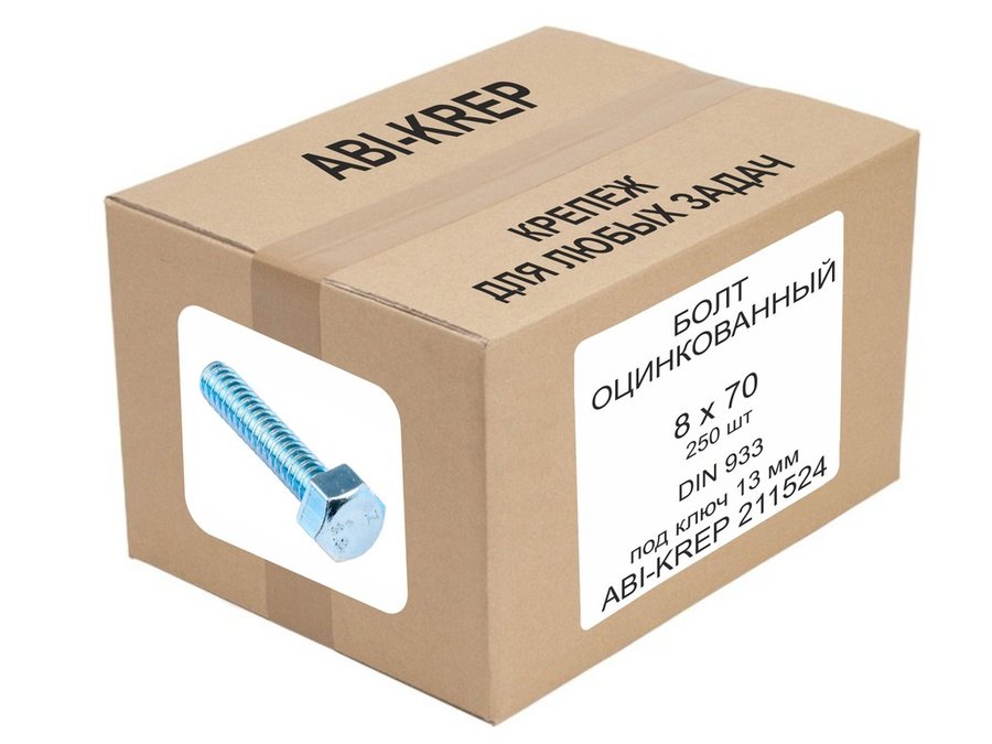 В корзину Купить в 1 клик Болт оцинкованный 8х 70 DIN 933 ( 250шт) "ABI-KREP 211524" 7,05кг, ключ 13мм, 28,2гр цена за 250шт