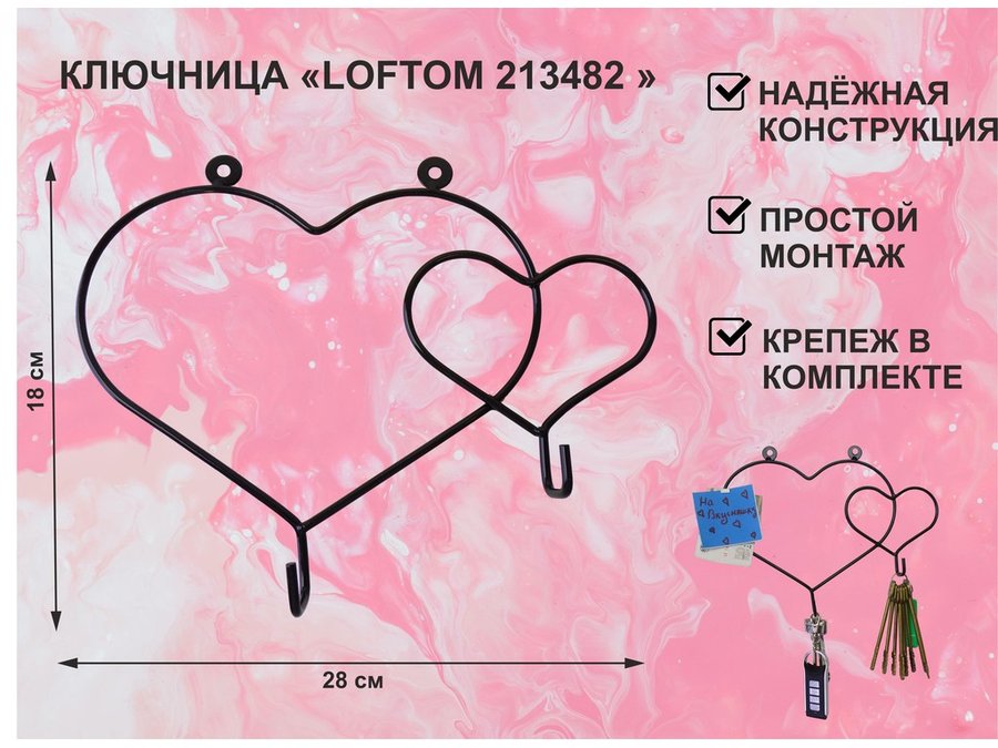 Ключница с крючком и 3 магнитами для записок и фотографий, 3 сердца,вешалка, чёрный "ABILOVE 213495"