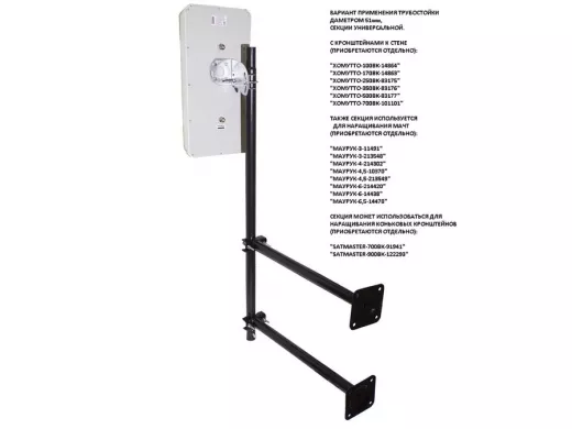 - Данную секцию можно использовать в качестве как нижнего звена мачты , т.к. в нижней части секции есть отвестия для установки подпятника, так и в качестве среднего или верхнего звена за счёт наличия болта для фиксации звена к звену на одном конце секции и обжатия трубы на другом конце. Также применяется с кронштейнами "ХОМУТТО" для крепления к стене и на торец крыши анттенн, также подходит для коньковых кронштейнов серии "SATMASTER-700", "SATMASTER-900".