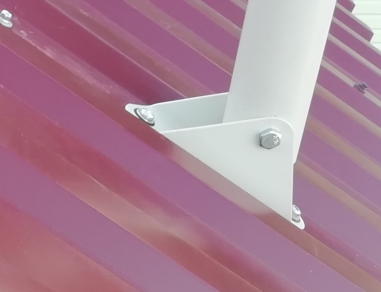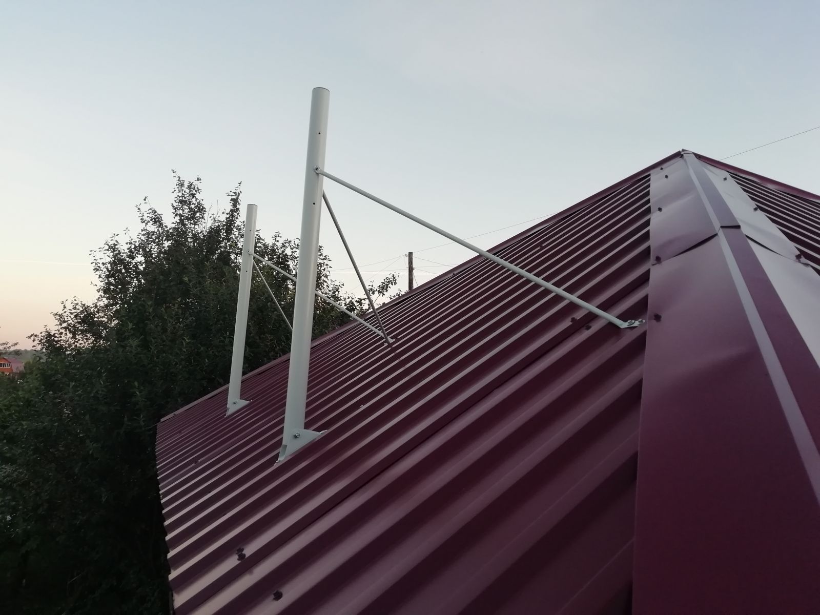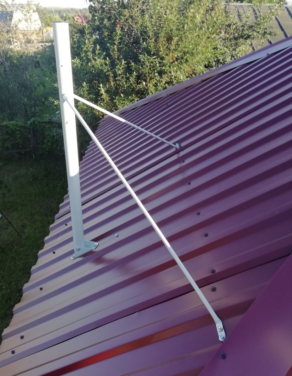 - Для крепления используются два отверстия в подпятнике и по одному отверстию в каждой растяжке. Удобно использовать кровельные саморезы максимального диаметра и длины, чтобы обеспечить надёжность фиксации.