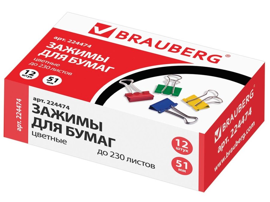 В корзину Купить в 1 клик Большие зажимы для бумаг"BR 76698" , КОМПЛЕКТ 12 шт, 51 мм, на 230 листов, цветные, карт.кор.