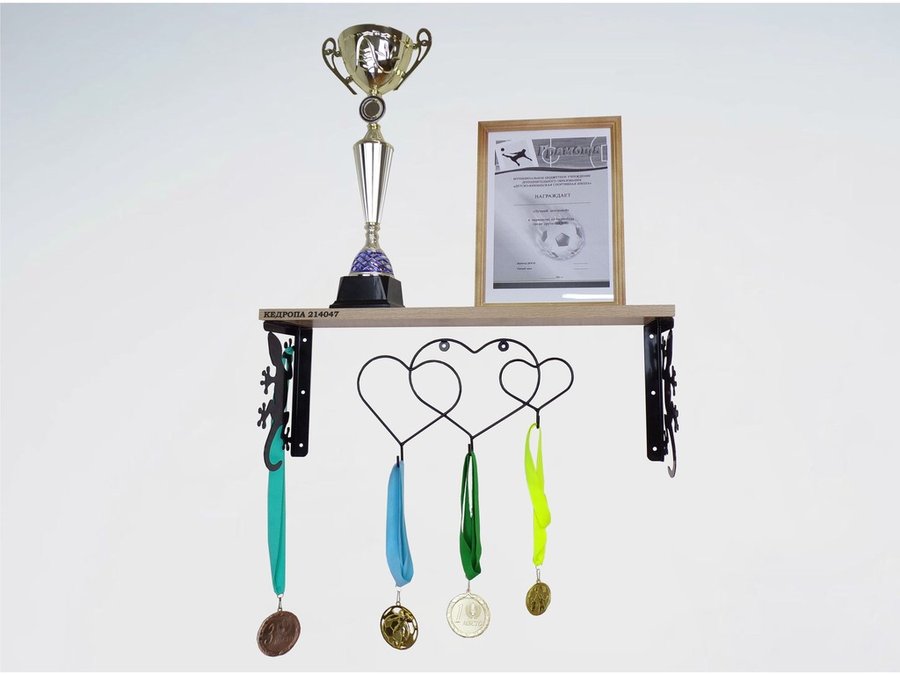 Полка для наград, кубков, медалей, грамот "КЕДРОПА-214047 гекон"размер 15х60х24 см, дуб с сердцами