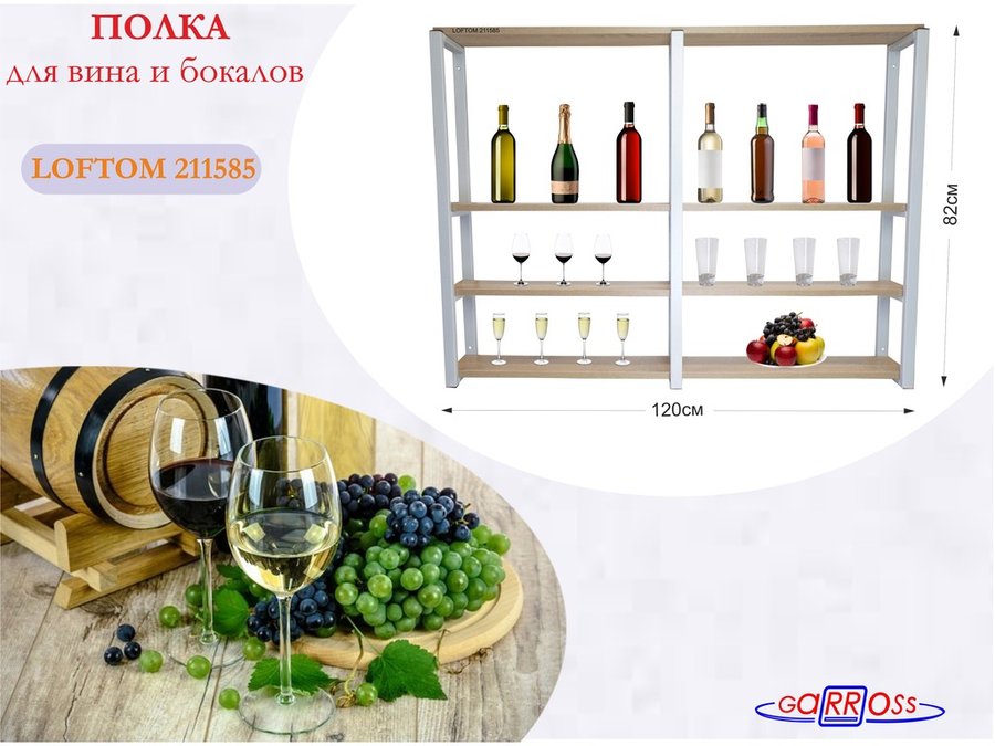 Полка для вина и бокалов, высота 82см, 4 уровня, размер полки 10х120см, серая "LOFTOM 211659"салатов