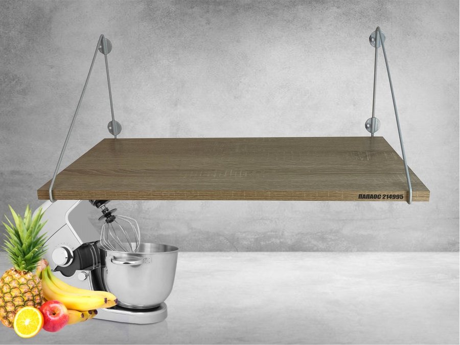 - Полка надежно крепится к стене при помощи анкеров или шурупов с дюбелями, на ней можно разместить микроволновую печь, кухонную технику, посуду, специи и многое другое