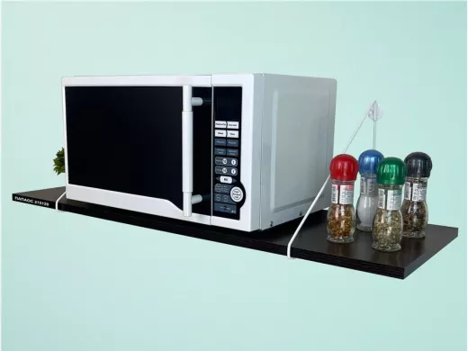 - Полка надежно крепится к стене при помощи анкеров или шурупов с дюбелями, на ней можно разместить микроволновую печь, кухонную технику, посуду, специи