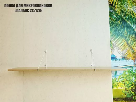 • Полка надежно крепится к стене при помощи анкеров или шурупов с дюбелями, на ней можно разместить микроволновую печь, кухонную технику, посуду, специи