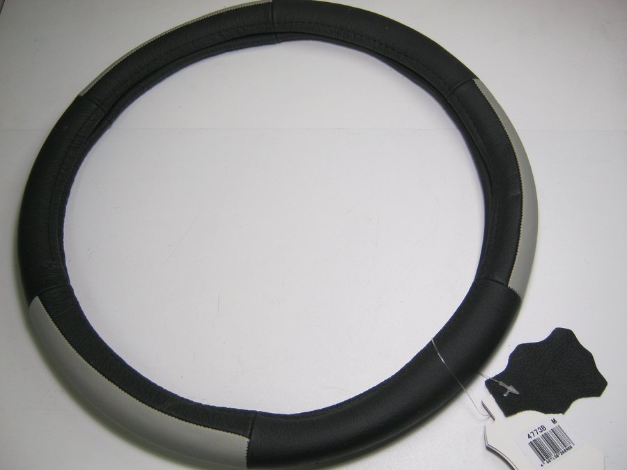 В корзину Купить в 1 клик Оплетка на руль 38 см. M 4773B кожа черная+серая кожа вставка сверху "гладкая"