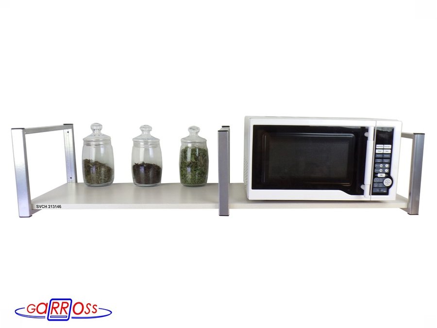 • Полка надежно крепится к стене при помощи анкеров или шурупов с дюбелями, на ней можно разместить микроволнрвую печь, кухонную технику, посуду, специи