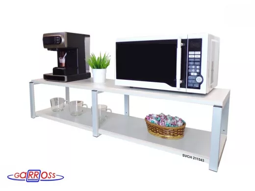 • Полка надежно крепится к стене при помощи анкеров или шурупов с дюбелями, на ней можно разместить микроволнрвую печь, кухонную технику, посуду, специи