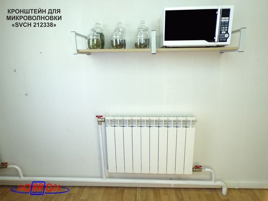 - Полка надежно крепится к стене при помощи анкеров или шурупов с дюбелями, на ней можно разместить микроволнрвую печь, кухонную технику, посуду, специи