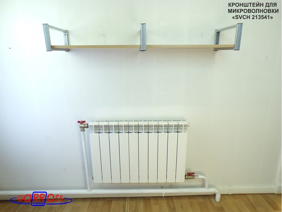 - Полка надежно крепится к стене при помощи анкеров или шурупов с дюбелями, на ней можно разместить микроволнрвую печь, кухонную технику, посуду, специи