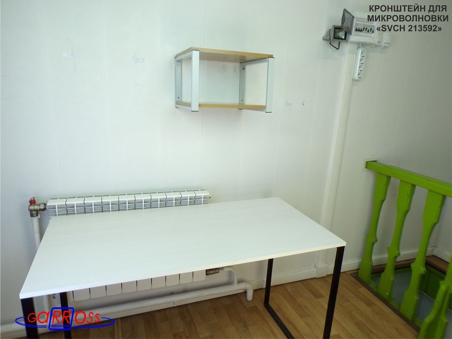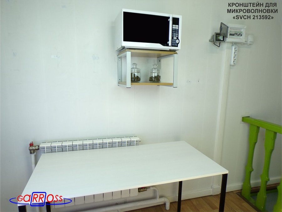 - Полка надежно крепится к стене при помощи шурупов с дюбелями, на ней можно разместить микроволновую печь, тостер, кофемашину, чайник, посуду, специи