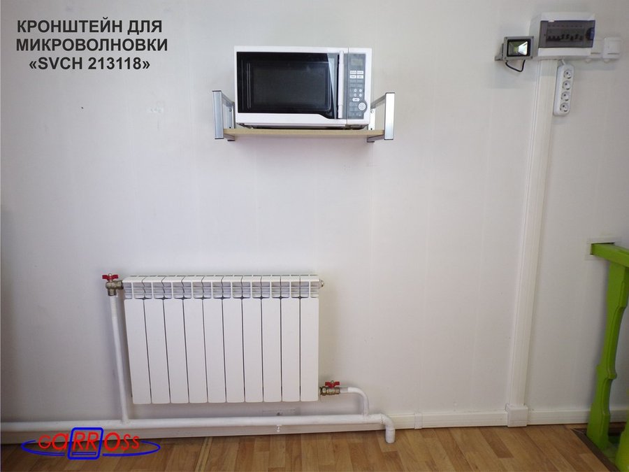 - Полка надежно крепится к стене при помощи анкеров или шурупов с дюбелями, на ней можно разместить микроволновую печь, кухонную технику, посуду, специи