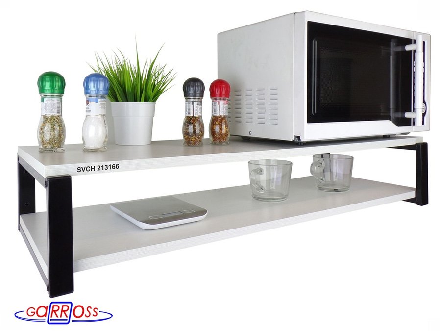 • Полка надежно крепится к стене при помощи анкеров или шурупов с дюбелями, на ней можно разместить микроволнрвую печь, кухонную технику, посуду, специи
